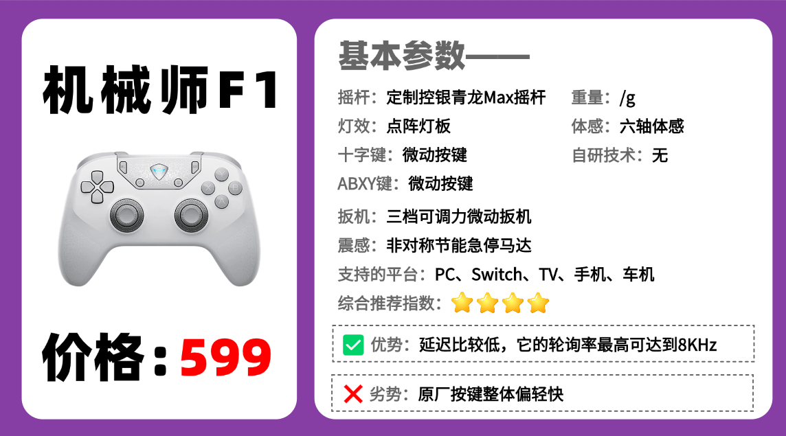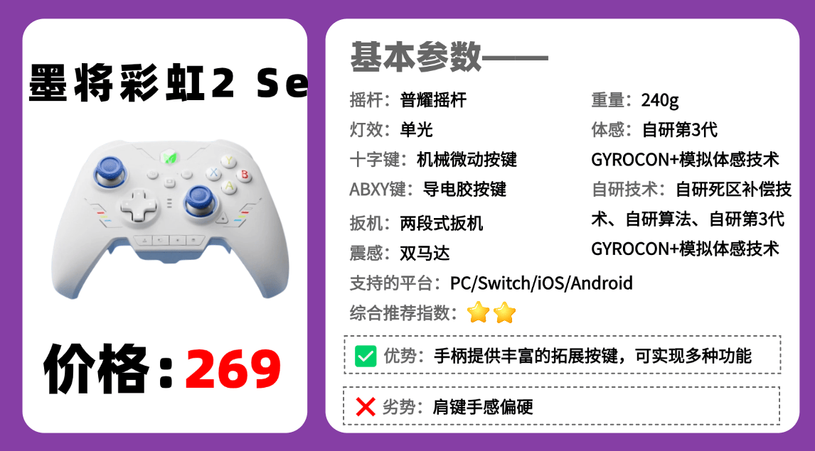 使用体验上偏实用、易上手,支持三模连接,并能一键唤醒Switch 2,多设备切换非常便捷;非对称震动配合多指位设计,在动作和体感游戏中更沉浸。续航方面1500mAh属于中规中矩,一场长游戏或连续几晚娱乐都能满足。机身稍重,但带来的稳固感让操作更稳定,不过长时间握持对小手玩家可能略有压力。