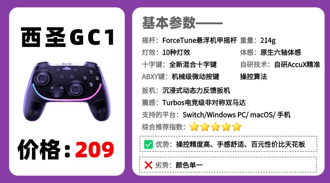 功能上,西圣GC1同样表现出色。0.5ms电竞级极速连接引擎+2.4G/蓝牙/Type-C三模,操作延迟极低、响应精准;原生六轴体感系统捕捉旋转、倾斜、挥动等动作,射击瞄准和赛车漂移更稳更准;214g轻量机身、15°握角、NanoSkin防滑涂层,长时间握持舒适稳固;半透明幻雾晶透机身+10种RGB灯效,科技感十足;全平台兼容手机、PC、Switch等设备,一机畅玩。整体配置扎实,真的是强悍到没有对手能超越。