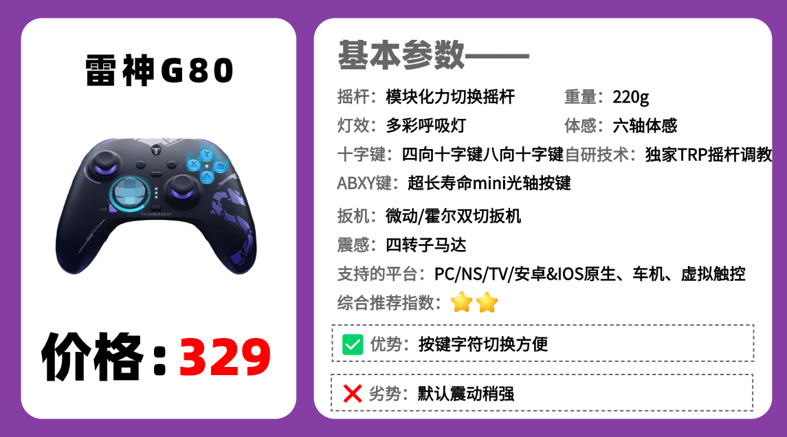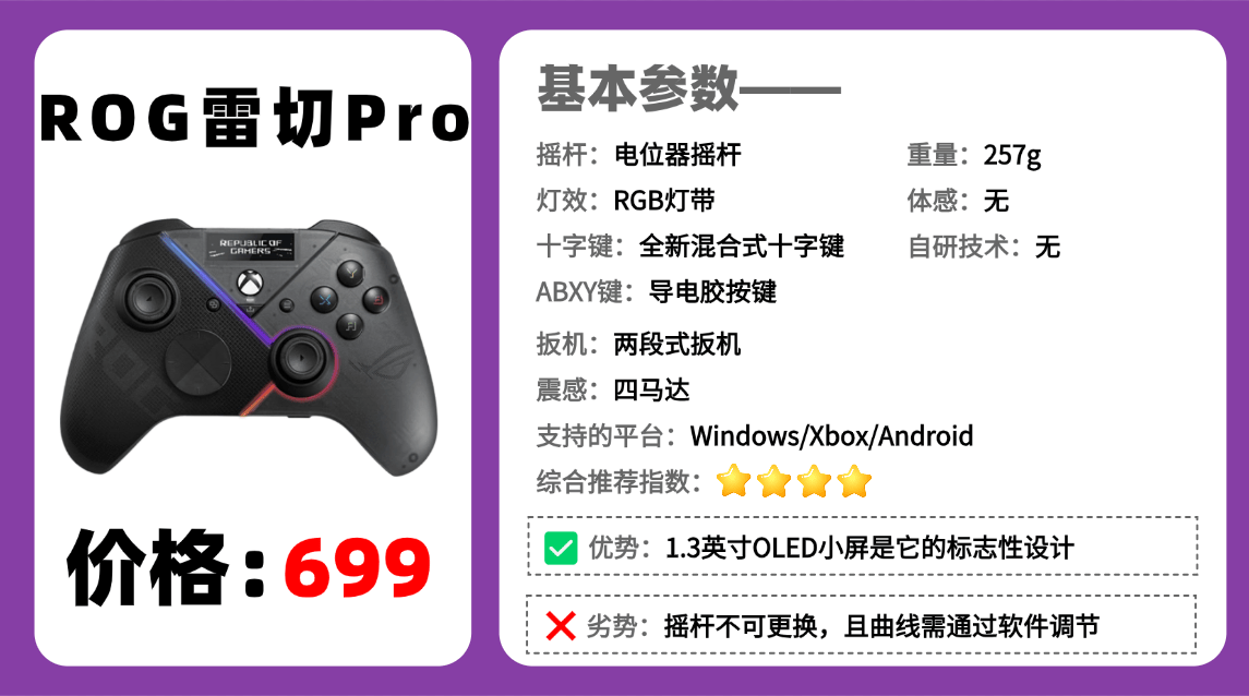 在核心性能方面,它针对FPS游戏优化,配备碳膜摇杆,支持2000级分辨率,有线模式1000Hz回报率(2.4G/蓝牙125Hz),操作更顺滑、微操精准,边缘金属环和自适应校准延长了使用寿命。十字键是可替换微动,响应清晰;顶部扳机为霍尔板机,阻尼感适中,并支持两段扳机锁切换。手柄支持三模连接,兼容PC、Switch、安卓及iOS设备,带陀螺仪,重量约240g,内置1000mAh电池续航约20小时。