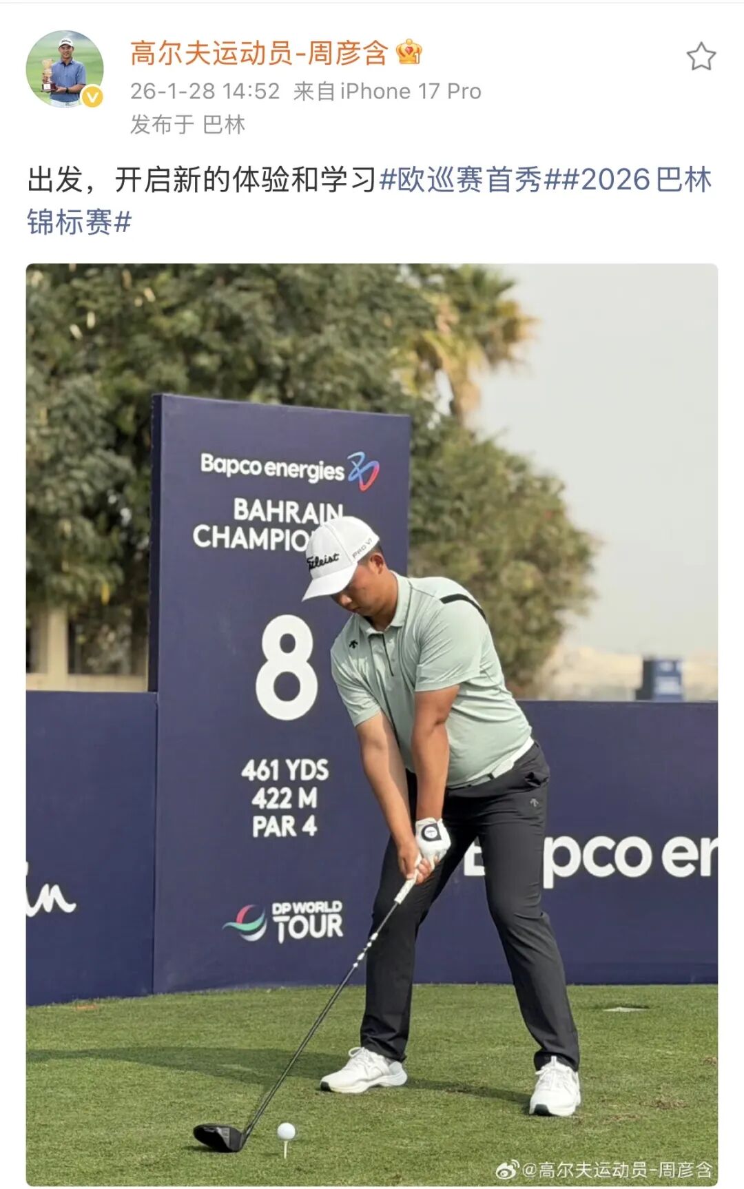 北京时间1月28日,继迪拜邀请赛和迪拜沙漠精英赛之后,欧巡赛连续第三周于中东举办赛事。本周,国际挥杆系列赛将在巴林锦标赛中继续展开。
