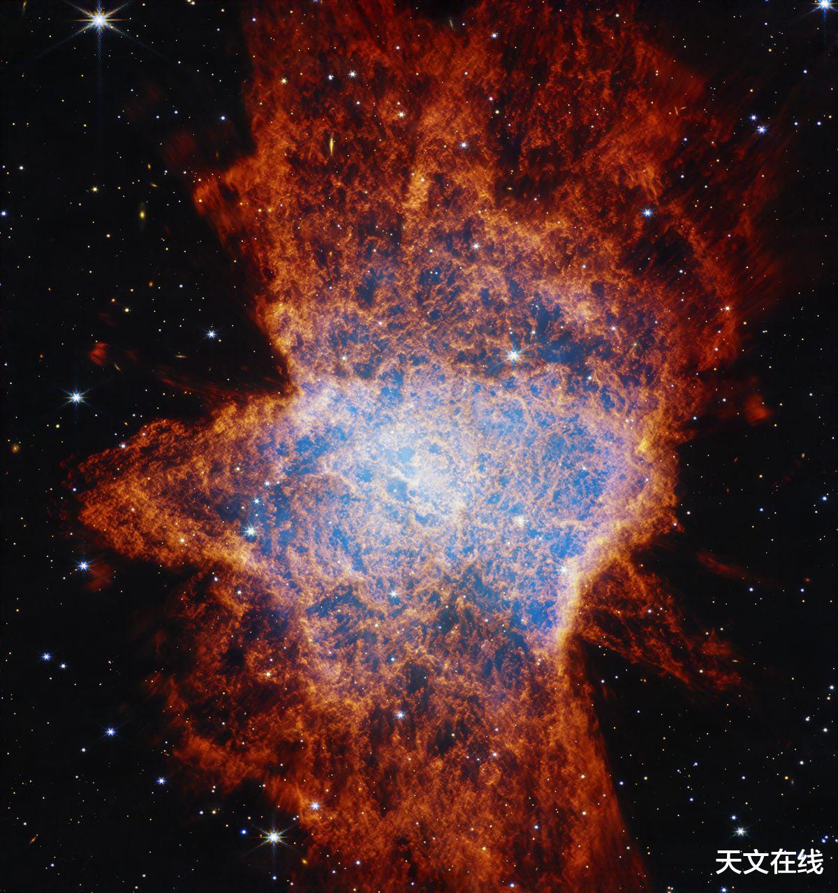 正如韦伯望远镜拍摄的两张图像中显示的那样,一张是在较短波长的近红外光下拍摄的,另一张是在中红外波长下拍摄的,星云的形状出奇的复杂——这表明有很多肉眼看不到的事情正在发生。
