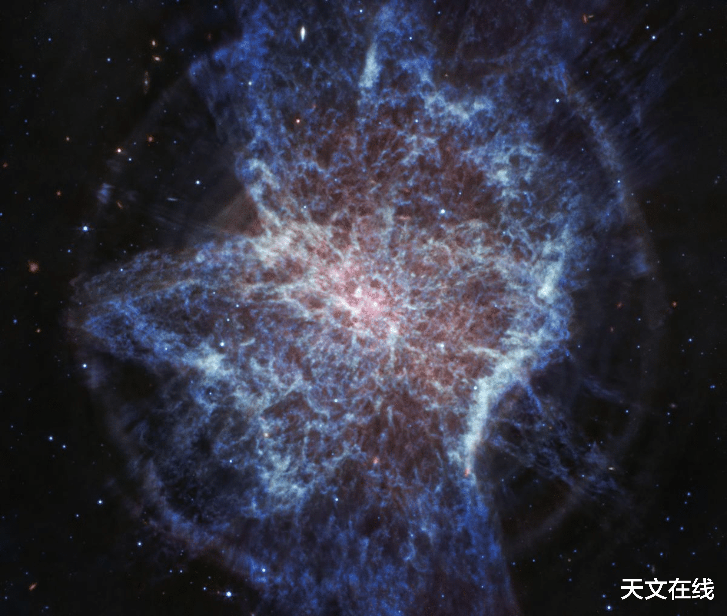 由于韦伯望远镜的中红外仪器能够看到不被尘埃吸收的光,它打开了一扇通往星云中心的窗户,在那里我们可以看到中心恒星系统是一个粉白色的点。然而,如果那里有一颗伴星,它离垂死的恒星太近了,以至于即使是韦伯望远镜也无法将两者解析为单独的物体。