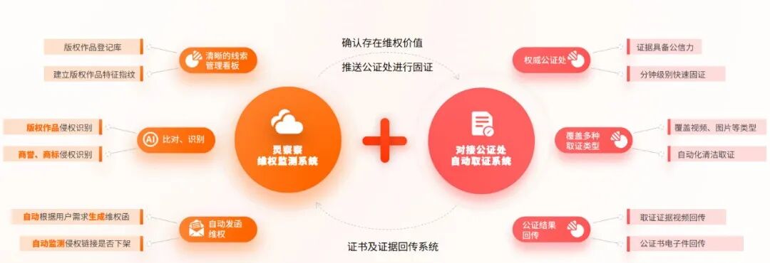 除了以上精准监测,灵察察还与公证机构的电子数据保全证据系统相对接,实现了“一站式”服务。具体来说,灵察察在识别到“疑似侵权线索”后, 会将该线索推送给权利人进行人工校验; 在权利人校验通过并发起取证需求后,系统将自动调用公证处电子存证系统的接口,将该侵权快照、链接等线索信息推送至存证系统,由公证处依法完成取证。同时,灵察察会智能根据证据内容自动生成维权投诉函供权利人参考,更能根据用户个性化需求,生成侵权比对表,快捷制作证据。可以说,灵察察以标准化的全链路技术流程,解决了传统维权中取证烦琐、周期冗长、耗时耗力等难题,实现从“确权”到“高效维权”的无缝衔接,构建起全方位、智能化的版权保护闭环,为权利人的合法权益筑起坚实屏障。