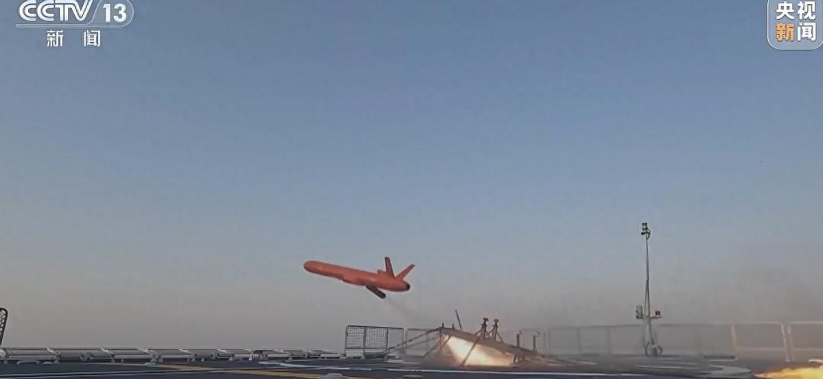 随后,淮南舰发射干扰弹。这里央视没有说明干扰弹类型,不过联系到“拉斯姆”的制导方式为惯性、红外、GPS卫星信号等复合制导模式,并装有被动雷达导引头,因此可以猜测干扰弹应为红外诱饵弹+箔条干扰弹,力求实现全方位的干扰。而且用上干扰弹,说明此时“导弹”已经距离淮南舰不远,至少进入近程防空范围,所以这是一次检验近防系统防空效能的演习。