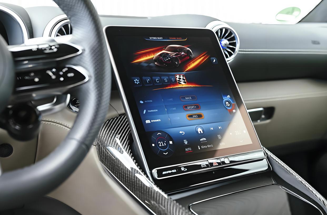 梅赛德斯AMG GT63 4MATIC+以“超模拟”座舱概念以驾驶者为中心,全数字仪表屏与立体遮阳板一体化集成。中控台配备了碳纤维壳体和麂皮绒材质包裹的设计,两侧还加入了大尺寸碳纤维换挡拨片,操控岛的区域更加简洁明了,还配备了飞机涡轮样式的空调出风口设计,大面积Alcantara面料、银色金属材质以及黑色碳纤维材质的交替运用,带来了丰富的层次感,质感也更加高级。车内采用了2+2座椅布局,前排座椅具备加热/通风/记忆等功能。还配备了置悬浮式的11.9英寸中控屏,12.3英寸的彩色全液晶仪表以及HUD抬头显示系统,搭载第二代MBUX智能人机交互系统,内置奔驰MBUX人机交互车机系统,并包含了手机连接、智能呼叫以及Mercedes me互联功能。