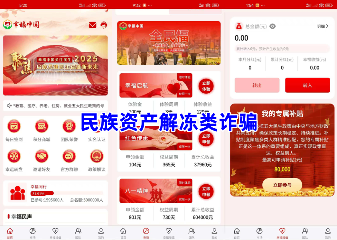 民族资产解冻类诈骗。不法分子冒充某部门的名义,打着领取“民生补贴”的旗号,制作散布涉诈APP,参与者实名注册可领取“补贴”,虚构推广“幸福起航”“红色传承”“八一精神”等高额返利项目。