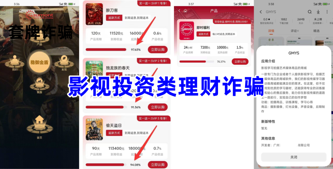 虚假理财诈骗。不法分子冒充某知名影视公司的名义,打着影视投资的旗号,虚构推广“醉刀客”“独龙族的春天”“小山河”“下一个台风”等影视投资理财项目。元旦期间,推出即时福利日收益率高达1.5%。(1月4日跑路)