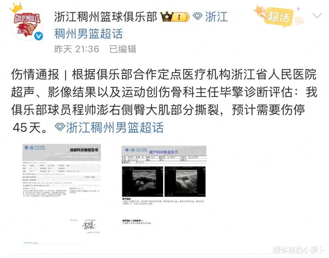 昨晚,浙江稠州男篮的一纸官宣,球队后场核心、国家队主力后卫程帅澎,被诊断为右侧臀大肌部分撕裂,预计将伤停整整45天。