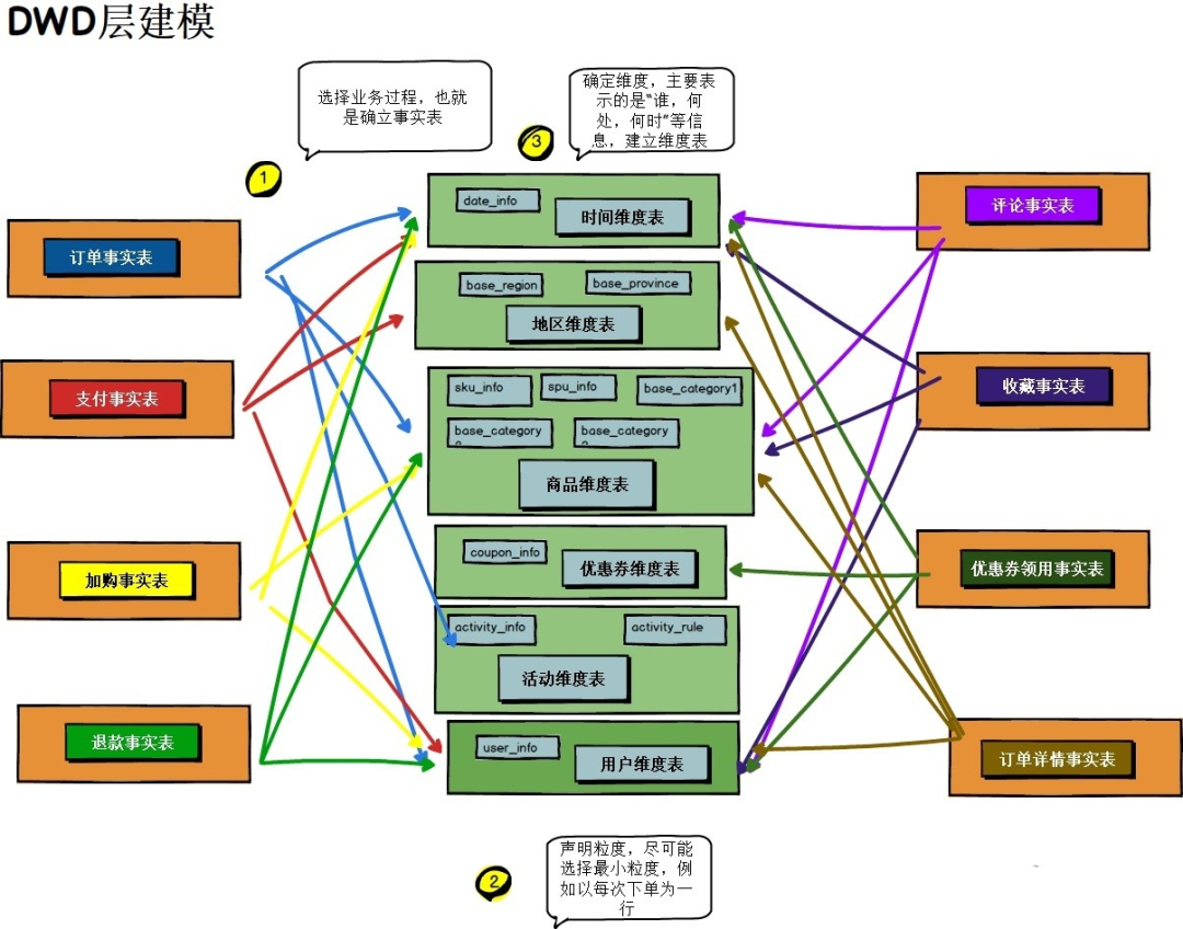 维度退化。 这是DWD层一个比较重要的设计手段。简单来说,就是把一些维度信息直接冗余到事实表里,减少查询时的关联操作。比如订单ID这个维度,数据量极大,单独建一张维度表意义不大,就直接冗余在事实表里。