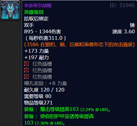 属性:双手锤,311秒伤+103破甲+103暴击,三红孔插槽