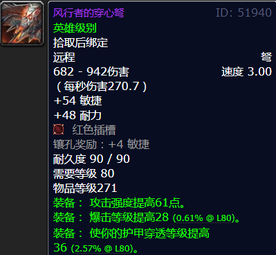 属性:远程弩,270.7秒伤+61攻强+36破甲,红孔+4敏捷