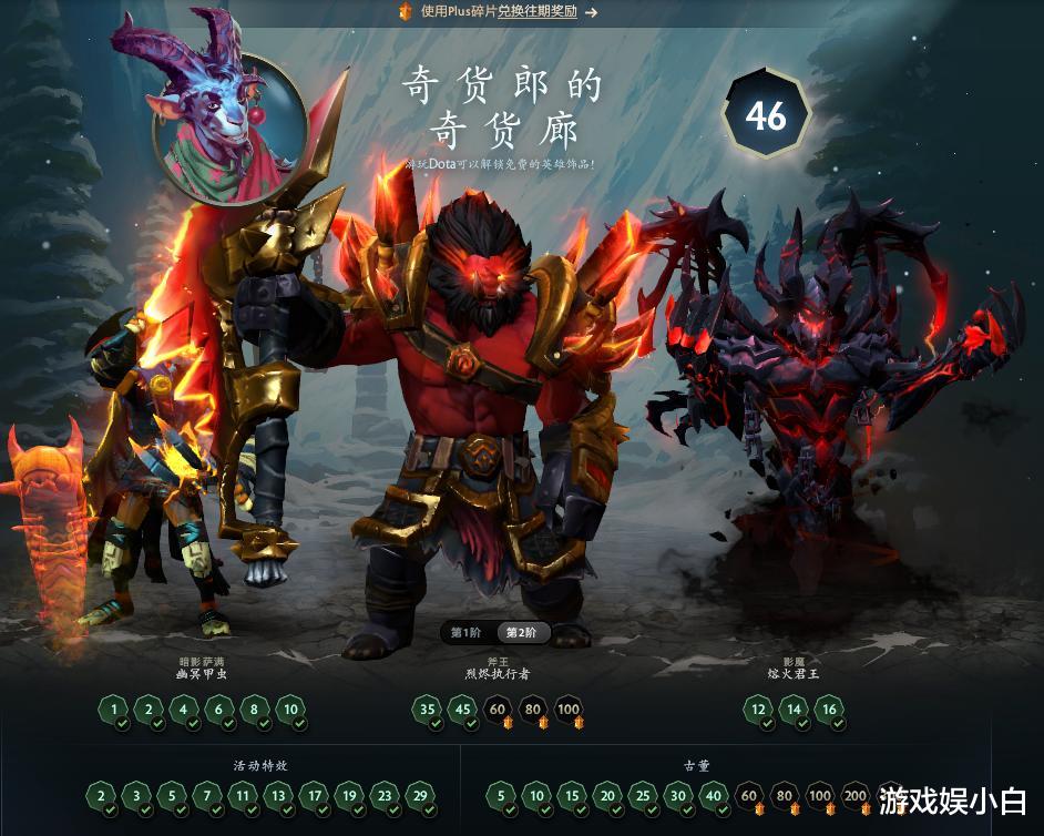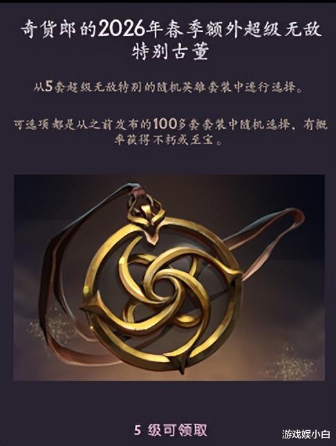 最重磅的奖励是——玩家在5级、10级、15级、20级、25级、30级、40级、60级、80、100级、200级和300级依然可以获得奇货郎的古董,开启奇货郎的古董可随机获得100余套往年推出的英雄套装中的一套,或者以较小概率获得一件不朽或至宝。其中5级的奖励为“奇货郎的额外超级无敌特别古董”,玩家可从5套超级无敌特别的随机英雄套装中选行选择,可选项都是从之前发布的100多套套装中随机选择,有概率获得不朽或至宝。现在开启古董后后,五个备选奖励将不会重复。