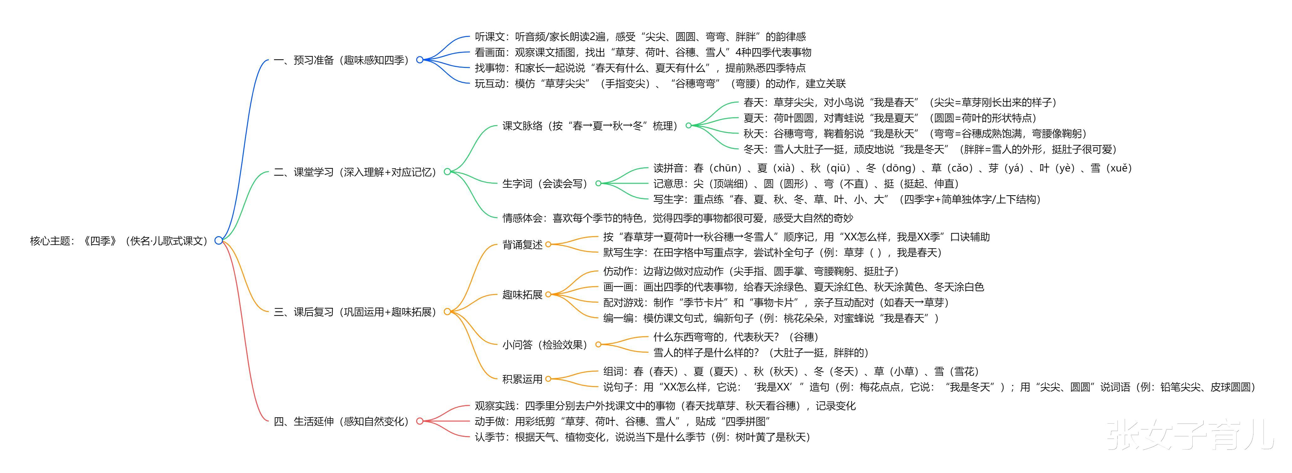 预习部分:控制在 10 分钟内,重点用 “动作模仿 + 找事物” 激发兴趣,不用提前背诵,让孩子先感受四季的画面感;