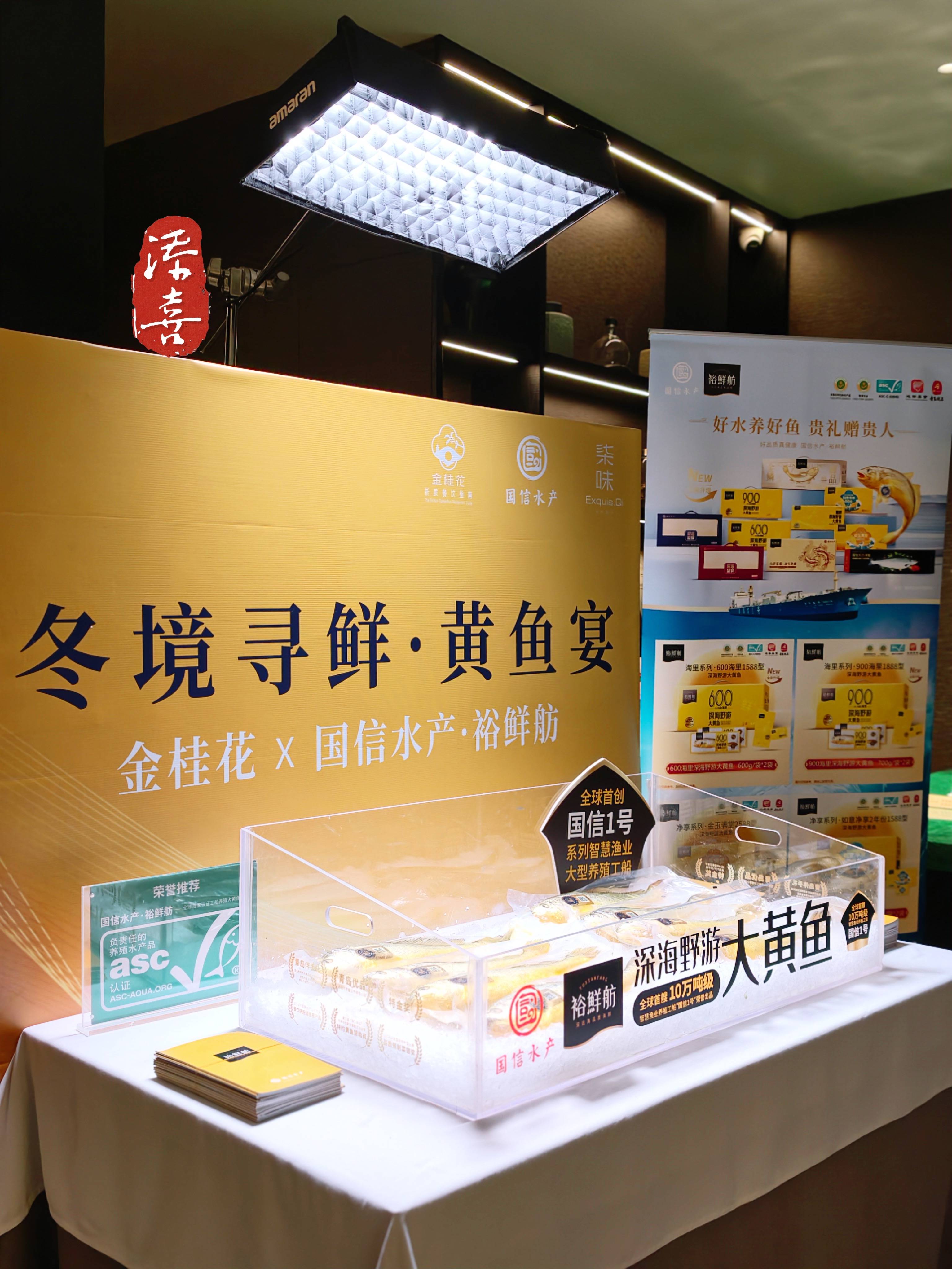 当晚活动的主角是来自国信水产的“大黄鱼“。国信水产是依托现代化海洋牧场与前沿科技养殖体系,构建起涵盖良种选育、生态养殖、全程可追溯的完整现代渔业解决方案,从源头上确保黄鱼品质的纯净与稳定。