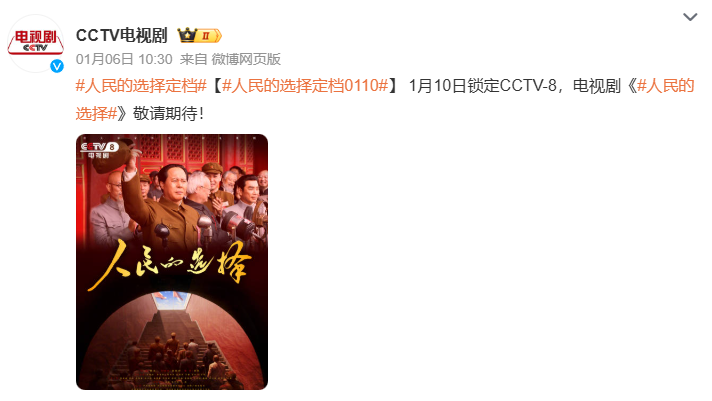 筹备三年、历经多地实景拍摄的36集史诗巨作《人民的选择》正式官宣定档,将于2026年1月10日登陆央视八套黄金档。