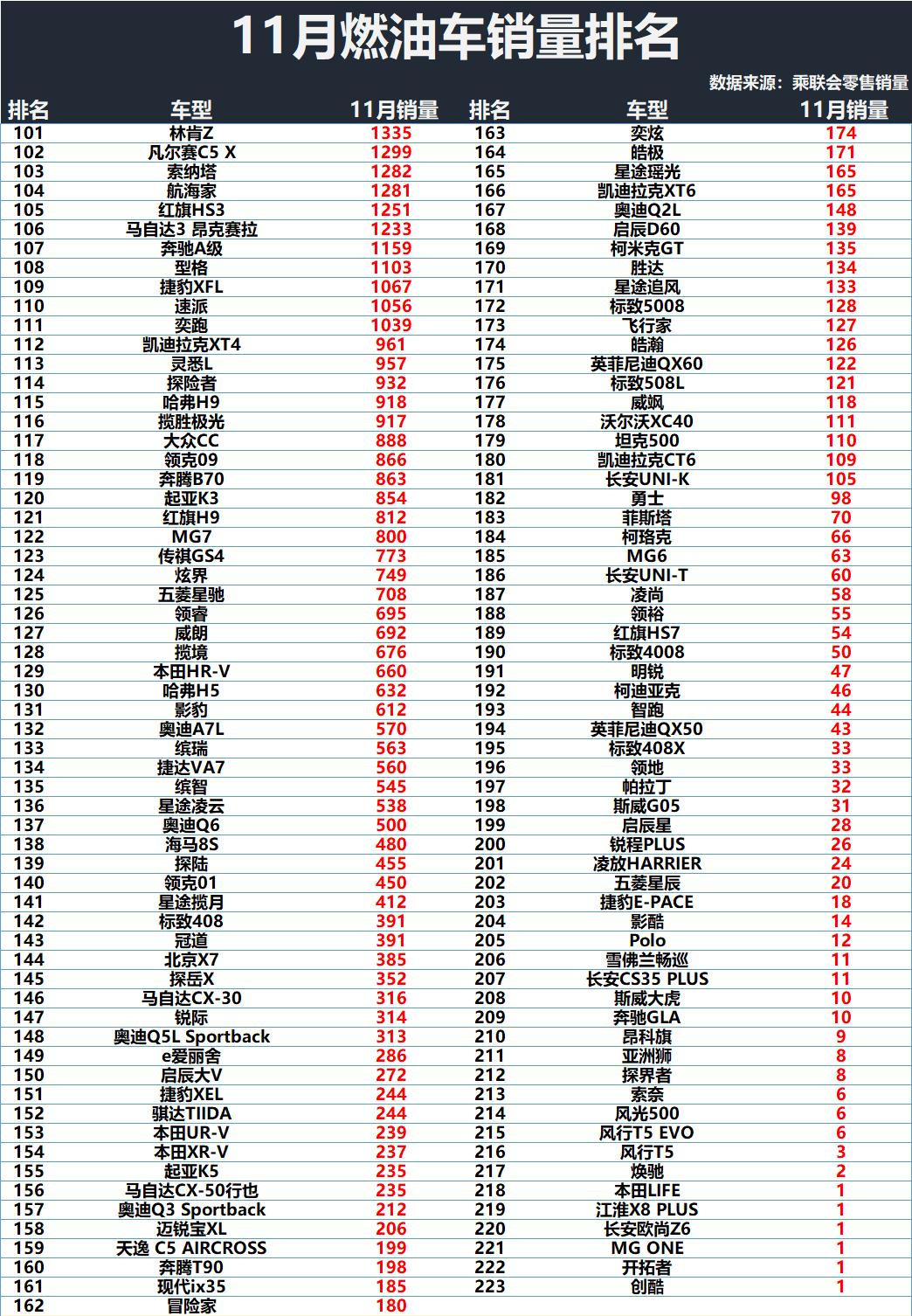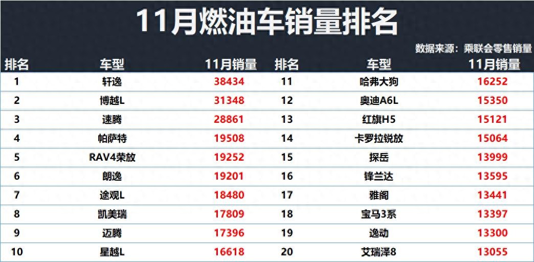 然而,市场的分化同样触目惊心:曾经的主流车型如本田CR-V、丰田卡罗拉,虽然销量仍在万辆以上,但排名已滑落至20名开外;而超过百款车型的月销量已不足千辆,徘徊在市场边缘。这种“头部回暖、长尾萎缩”的格局,清晰揭示了燃油车市场正在进行的深刻洗牌。再次大胜!11月燃油车销量榜:5千辆进不了前50,朗逸第6,逍客30!