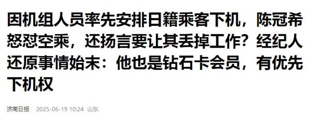 信息来源:因机组人员率先安排日籍乘客下机,陈冠希怒怼空乘,还扬言要让其丢掉工作?经纪人还原事情始末:他也是钻石卡会员,有优先下机权 济南日报2025-06-19 10:24山东