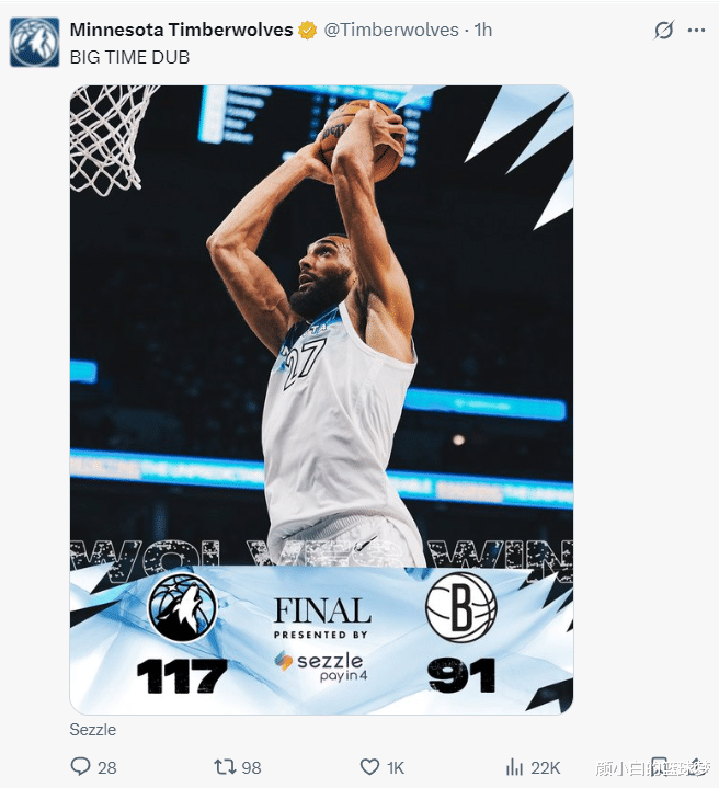 森林狼117-97大胜篮网拿到48胜33负掌控了前六曙光,如果这场输球森林狼也将无缘前六,好在戈贝尔35+11大爆发击溃篮网,灰熊与森林狼已经拉开1个胜场。