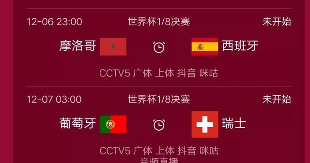 北京时间12月6日,世界杯淘汰赛会继续进行,今天会进行1/8决赛最后两场比赛,分别是摩洛哥对阵西班牙,葡萄牙对阵瑞士,在这两场比赛过后,八强会全部产生,展望这两场比赛大家还是看好西班牙和葡萄牙晋级,比赛将于今天晚上23点开打,央视会直播!