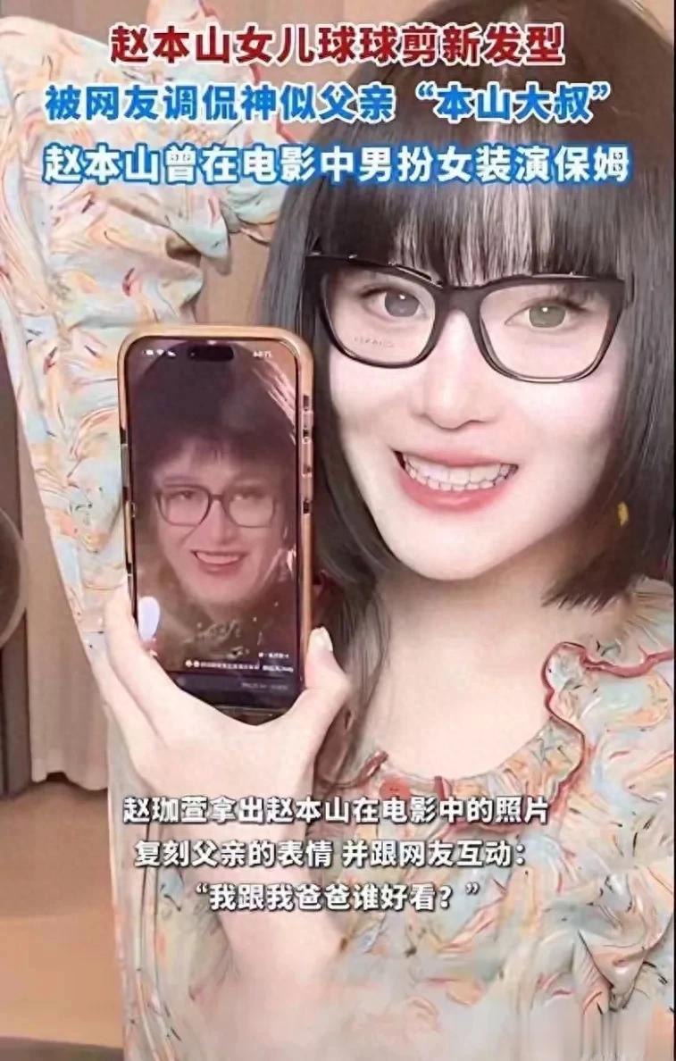 面对全网调侃,球球的反应堪称“互联网玩梗天花板”,不仅不生气,反而当场翻出老爸的旧照,对着镜头挑眉、抿嘴,复刻起赵本山的标志性表情,还灵魂发问:“大伙儿评评理,我和我爸谁好看?再留个齐刘海是不是更像了?” 直播间瞬间被弹幕淹没,粉丝补刀一个比一个狠:“至少你比‘于妈’白!”“本来想走颜值赛道,结果直接继承了喜剧基因!”“这哪是剪头发,分明是做了次活体亲子鉴定!”