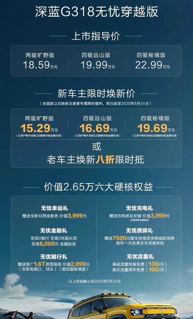 深蓝G318无忧穿越版于2023年4月18日正式上市,售价区间为18.59万到22.99万元,期间还推出限时焕新价,让购车者有机会以低至15.29万元的价格入手。这一价格在同级别车型中毫无疑问是极具竞争力的,更值得注意的是,购车者还可享受价值高达2.65万元的六大权益,包括全新日照金配色、充电桩安装、整车终身质保商城抵用券、以及基础流量终身免费的优惠待遇。这些权益不仅让消费者享受到超值购车体验,同时也在一定程度上缓解了未来使用过程中的成本压力。