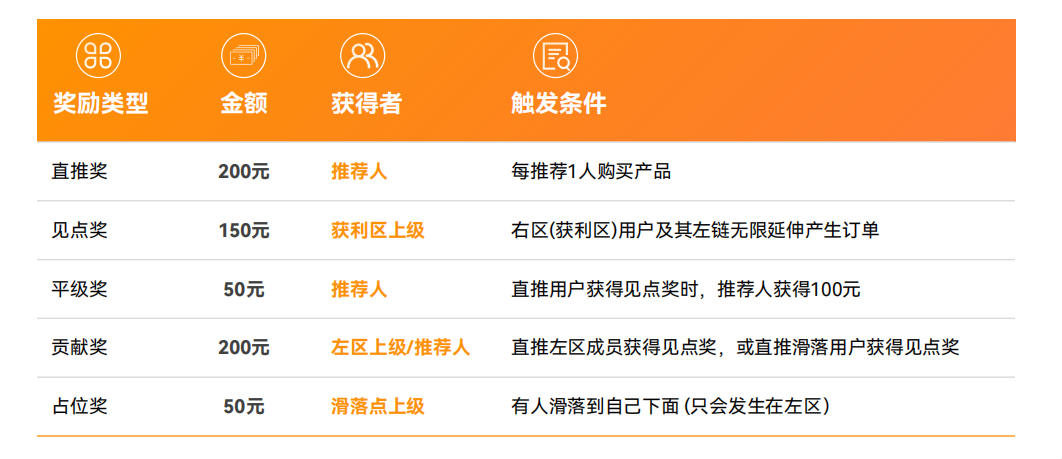 贡献奖 200 元,直推的左区成员或滑落用户赚见点奖,你同步拿钱;