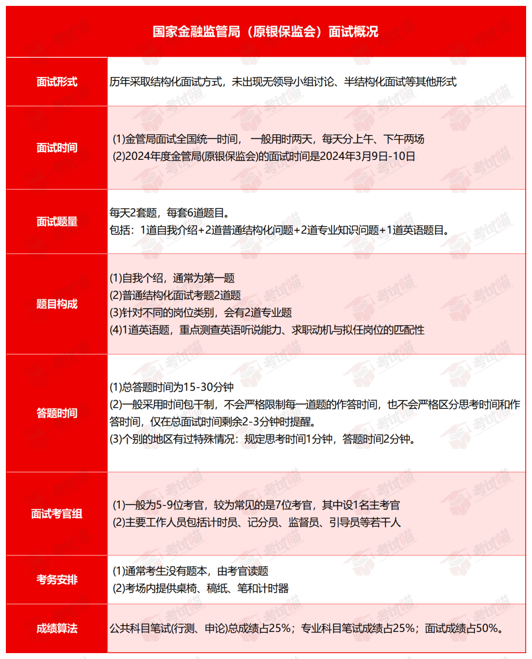 ①以结构化形式考核居多,即一般30分钟时间给定6个题目,考生听一题回答一题,6题结束后就答题结束,但是部分省份也可能出现追问。需要格外注意的是从2021年开始,多数地区都将面试时间从原来的30分钟变为25分钟,答题时间缩短5分钟。