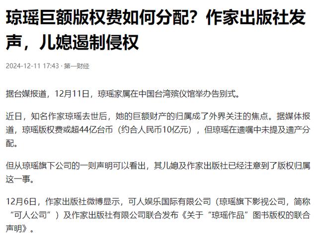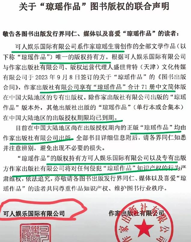 好在琼瑶的儿媳何琇琼发布声明,明确表示琼瑶作品的版权归可人娱乐公司所有,在她的掌控下,版权保护变得极为严格,任何试图盗用版权的行为都将面临律师信的警告。