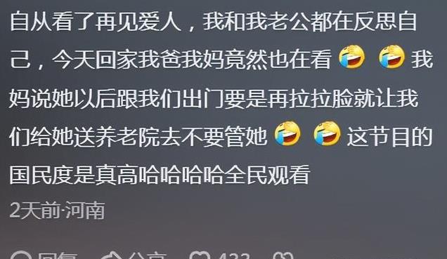看来“再见爱人”这节目是真的火啊,连你和你老公,还有你爸妈都在看!这节目能让大家反思自己,改善关系,真是挺好的。你妈妈还开起了玩笑,真是太可爱了