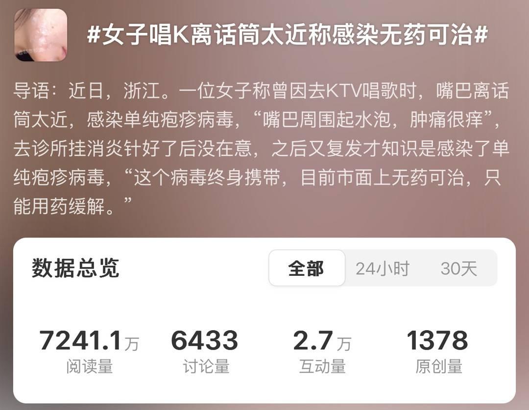 近日,浙江一名女子因模仿明星回应粉丝合唱K歌时的亲密动作,不慎感染单纯疱疹病毒的事件引发广泛关注。据报道,该女子因当时在KTV合唱时嘴巴与话筒距离过近,致使病毒通过话筒残留传播感染口唇部,随后病情反复发作,甚至在8年后出现病毒扩散至面部的情况,严重影响生活质量与心理健康。