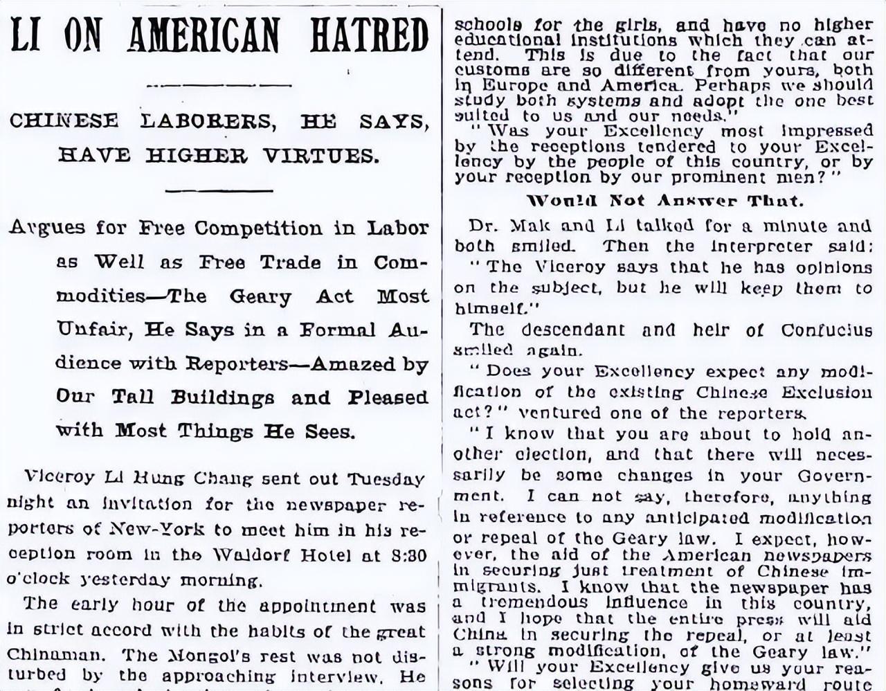 在1896年,李鸿章被誉为“东方俾斯麦”的晚清重臣,首次踏足美国。此行前他已遍访欧洲诸国,目睹了工业化的威力。在美国他看到了令人惊叹的摩天大楼,而当地政要与民众也急切盼望了解这位来自神秘东方大国的代表。在与记者的对话中,李鸿章发表了几句令人哭笑不得的言论。他究竟说了些什么?下面小史就带大家一起了解一下。