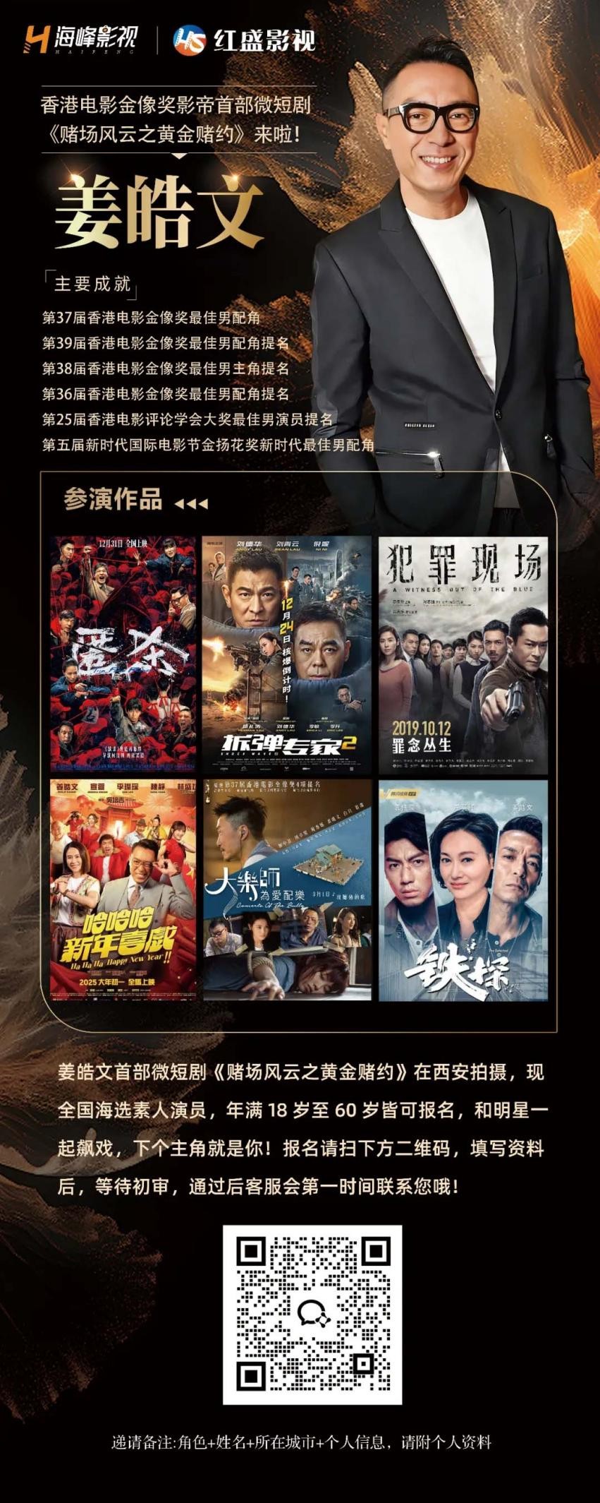 目前,《赌场风云之黄金赌约》独家播放平台锁定红果。海峰影视与红盛影视的双厂牌护航、姜皓文的港星演技加持、高能赌术剧情与素人海选的结合,有望为微短剧市场带来一部兼具港风质感与大众参与感的爆款作品。(详情关注微信视频号:红盛影视官方号)