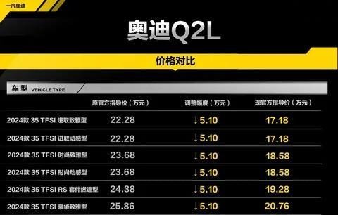 近日,一汽奥迪官方针对2024款奥迪Q2L进行了价格调整【全系官降5.1万元,调整后售价17.18-21万元(原售价22.28-26.1万元)】。另外,本次仅针对售价进行调整,而在车款数量、动力单元、功能配置等方面则保持不变。