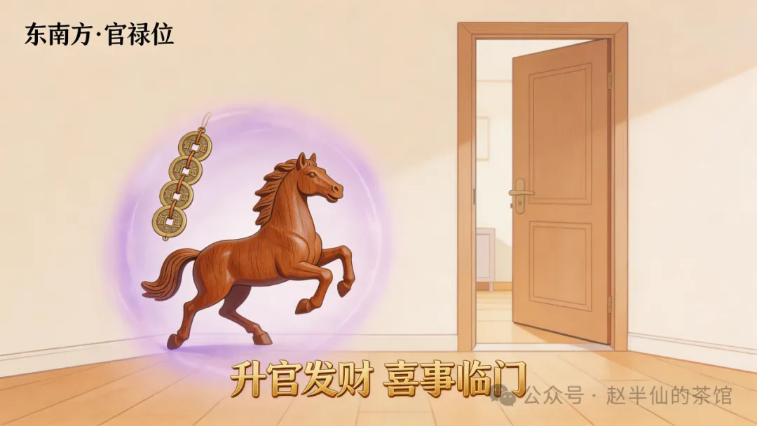 布局建议很简单,在东南方摆上五帝钱,或者木雕的马就可以。这里要跟大家强调,木雕马的摆放要求,和北方驿马位的马是一样的:绝对不能趴卧,必须是站立或奔跑的姿态,而且马头一定要“向门”!千万记住,要是马头向内,在天星风水里,就代表“马儿跑不出去”,你的晋升之路、发财之路,就会受到阻碍,这个细节马虎不得,一旦弄错,反而会影响运势。