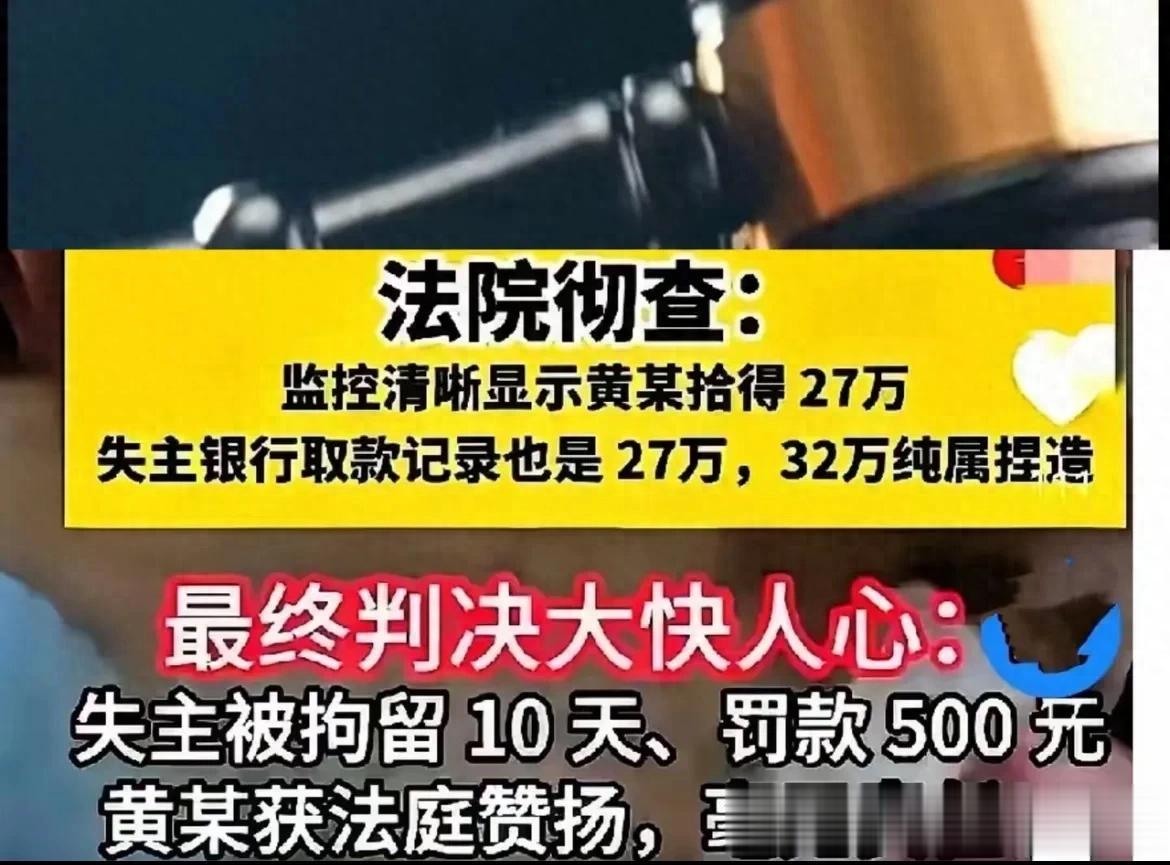 可谁能想到,失主非但不感恩,反而倒打一耙,谎称自己丢了32万元,要求黄某再拿出5万元,甚至闹上法庭企图讹诈。