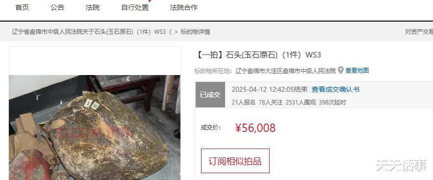 因为此次拍卖的玉石原石,没有切开看过,所以不知道石头内部品质如何。评估机构给出的评估价也是只有1285元而已,此次拍卖的起拍价为1028元。可能真是一个宝贝,所以此次拍卖,也是吸引了多达21人报名竞拍,竞拍非常激烈,21个竞拍者疯狂加价了521次才结束拍卖,最终以5.6008万元高价成交。