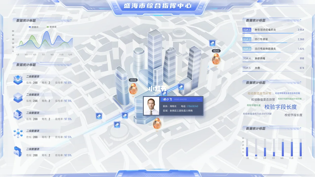 在医疗健康领域,数据大屏用于展示患者信息、医疗资源分配等数据。以某医院的医疗数据大屏为例,其 UI 设计采用了柔和的色调和简洁的图标,营造出温馨、舒适的视觉氛围,符合医疗环境的特点。实时数据更新功能实时获取患者的生命体征数据、检查报告等信息,并及时展示在大屏上,方便医护人员随时掌握患者的病情变化。动态展示功能通过数据的动态变化,如体温曲线的实时波动,直观反映患者的病情发展。交互功能方面,医护人员可以通过查询功能,快速获取特定患者的详细病历信息。该数据大屏的设计充分考虑了医疗场景的特殊性和医护人员的使用需求,通过创新的设计提升了医疗服务的质量和效率。