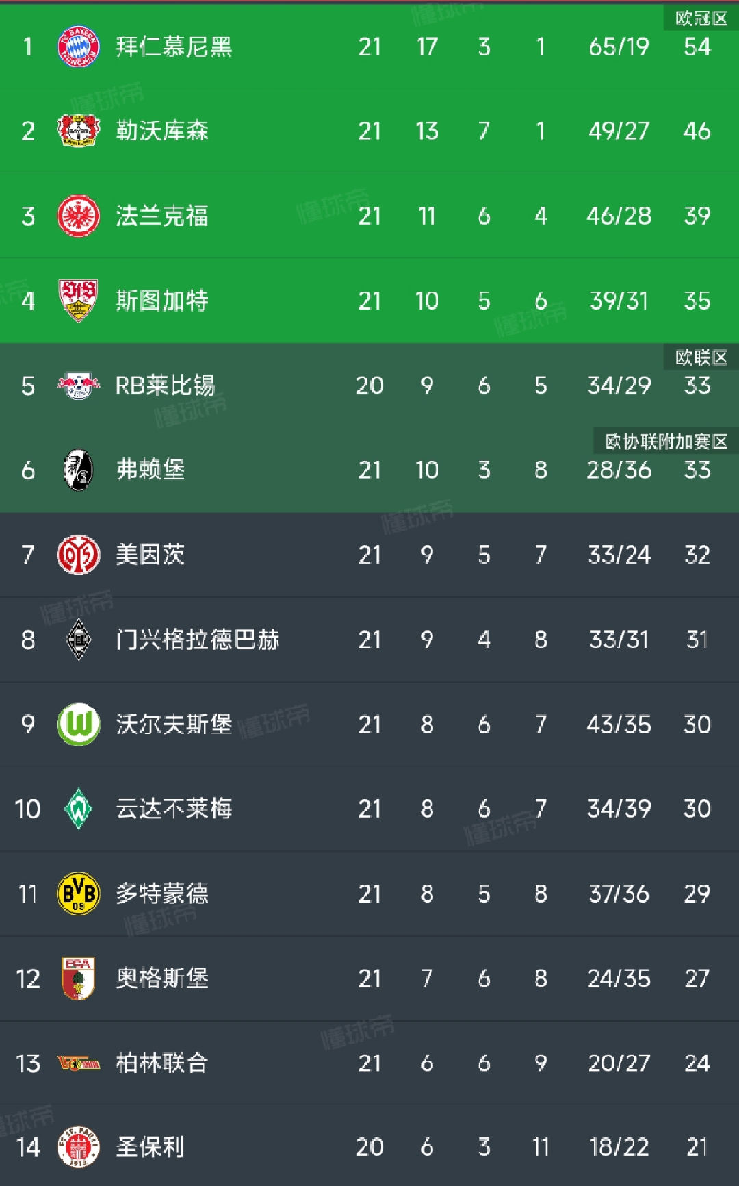 - 斯图加特(35分):凭借对多特的双杀暂时升至第4,成为欧冠资格的有力竞争者。