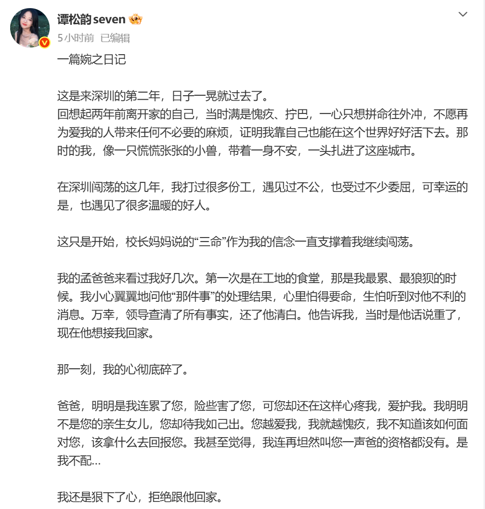 在谭松韵的笔下,方婉之的逃离与倔强不再是无端的“作”,而是一个背负着沉重枷锁的年轻人,试图在爱与愧疚中寻找自我救赎的艰难跋涉。日记里,她回忆起离开家时的满心愧疚与拧巴,一心只想拼命证明自己可以独立生存,不愿再成为爱她的人的负担。这份看似决绝的逃离,其内核其实是深深的爱与保护。当她在深圳的街头狼狈求生,打过无数份工,受过无数委屈时,支撑她的信念,除了外界的帮助,更有远方那份沉甸甸的牵挂。
