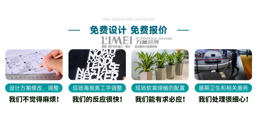 针对这些问题,力美会展推出针对性方案:一是采用 “3D 建模 + 激光定位” 双重管控,设计还原度提升至 97%,偏差控制在 3mm 以内;二是建立专项技术适配数据库,安排技术专员提前对接设备参数,核心设备展示适配率 99.5%;三是升级售后体系,展后 30 日内完成深度回访,终身提供展台复用咨询,售后响应时效≤2 小时。