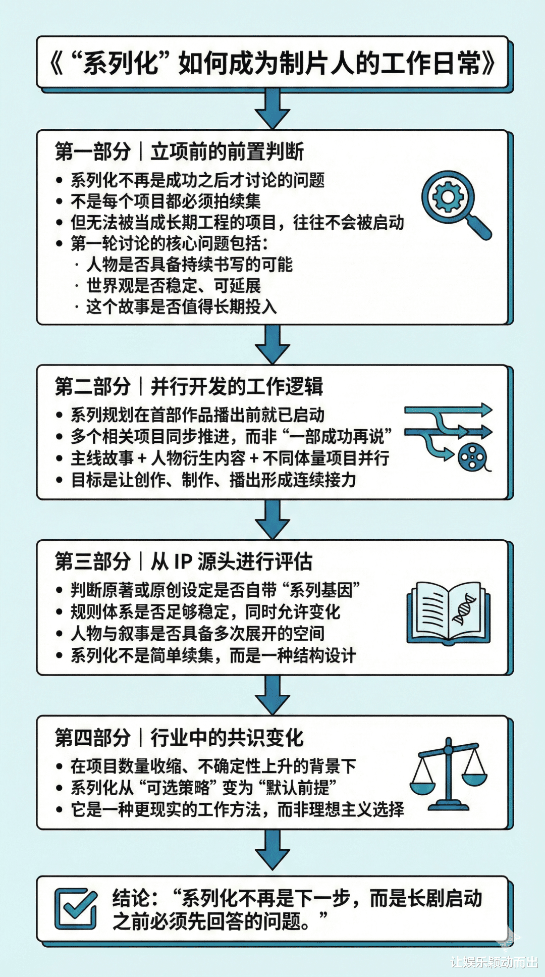 在项目数量收缩、不确定性上升的行业环境中,这种工作方式并不是出于理想主义,而是极为现实的选择。与其把全部筹码押在一次性成功上,不如提前判断哪些内容值得被长期对待。系列化正是在这样的判断中,被越来越多制片人纳入日常工作逻辑,成为长剧项目启动之前,必须先回答的问题之一。