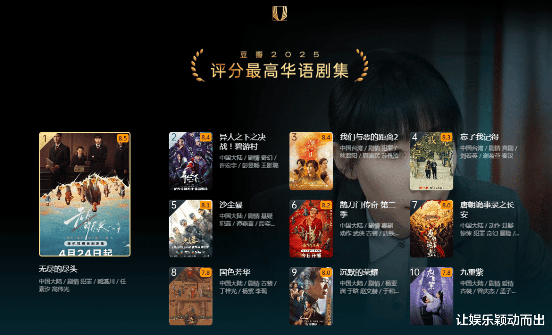 在刚刚公布的豆瓣 2025 评分最高华语剧 Top10 中,续集等系列化作品占据了一半席位。《唐朝诡事录之长安》超点完结一个月,至今仍稳居云合数据每日霸屏榜市占率TOP10;东北武侠风情景喜剧《鹊刀门传奇2》延续了前作气质,在类型融合上持续获得高分评价;《异人之下之决战!碧游村》也在播出过程中不断突破原有二次元圈层壁垒,让更多非核心受众完成“补课式追剧”。这些作品并非偶然走红,而是在观众熟悉的人物、世界观和叙事基础上,完成了一次又一次向前推进。