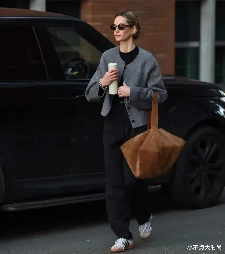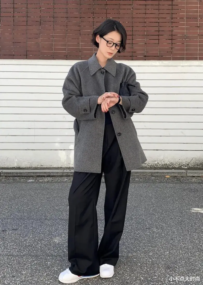 灰色的短款大衣内搭黑色打底衫,下身搭配黑色的高腰直筒裤,内搭深色同色系,视觉显高又显瘦。一整套干净极简,利落大方又气质。白色休闲鞋增添休闲感,松弛又自信。▼