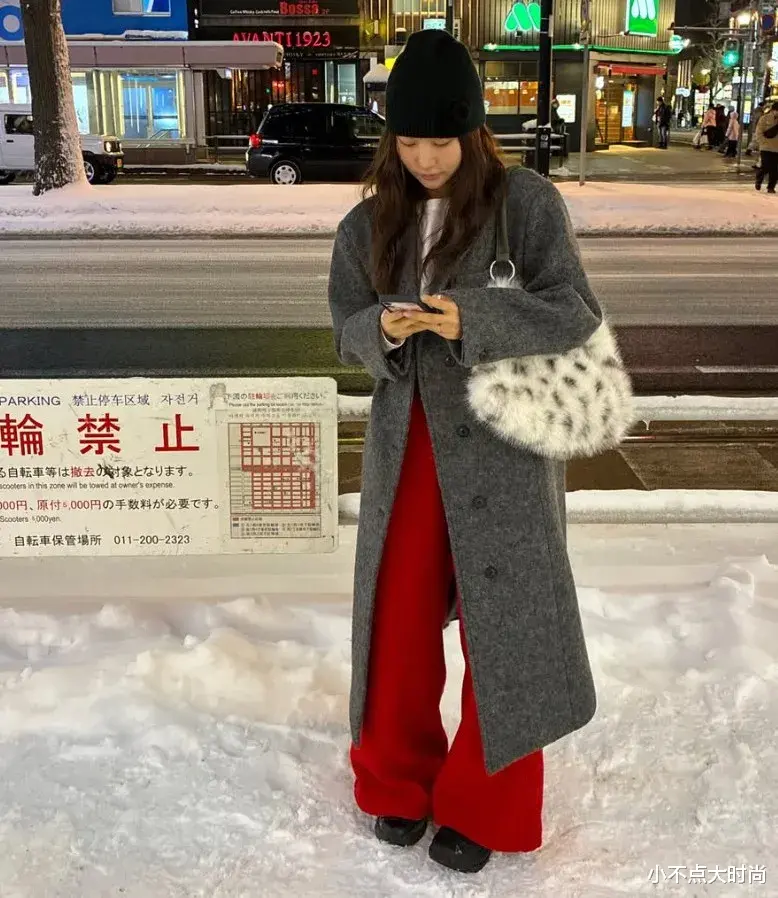 灰色的H型长款大衣经典显高又有质感,内搭复古红色的高腰裤特别吸睛,提亮穿搭,别有一番时尚感。▼