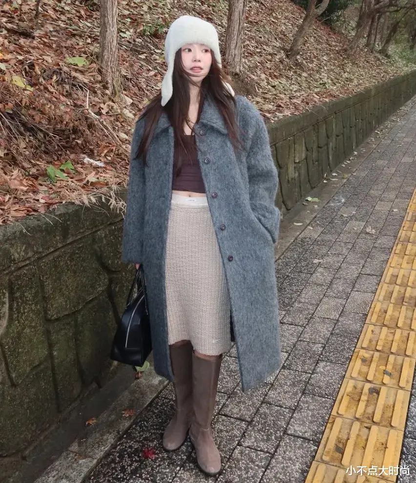 灰色“格雷大衣”内搭针织半身裙和棕色抹胸就很时髦,灰色的低调包容了内搭的温柔性感。麂皮绒靴子呼应内搭的色彩,复古又高级。白色的毛绒帽子恰当地可爱,舒服的韩系治愈氛围。一整套层次丰富又协调,气质高级又灵动。▼