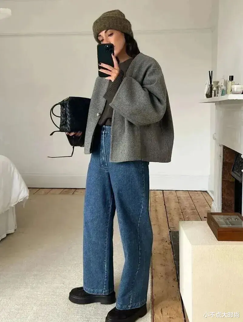 灰色的短款大衣简约低调,散发着高级感,搭配蓝色的高腰牛仔阔腿裤,内搭毛衣塞进裤腰内打造出高腰线,特别显高。一整套基础低调却有高级的质感,利落时髦又耐看。▼