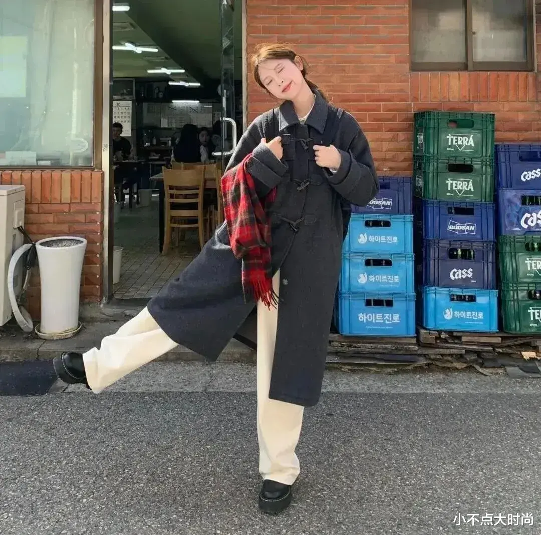 牛角扣的“格雷大衣”更加减龄轻松,搭配白色的阔腿裤,穿出了通勤的松弛感,时髦又简约,气质十足。红色的格纹围巾提亮搭配,复古又有冬季氛围感。▼