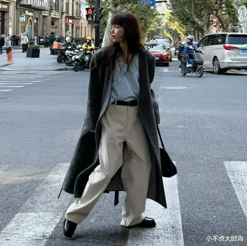 喜欢穿盐系风的矮个子姐妹,也可以尝试中长款的“格雷大衣”搭配高腰阔腿裤,阔腿裤最好是深色的,有视觉收缩感,适当宽松即可才好驾驭,轻松穿出时尚的松弛感,简约又高级。▼