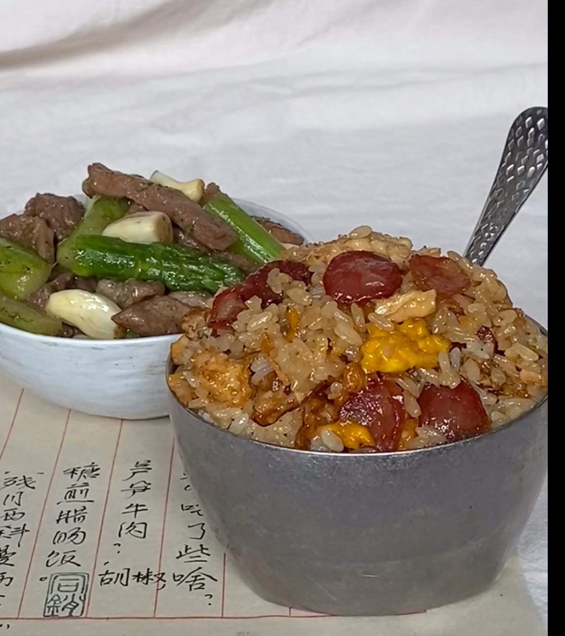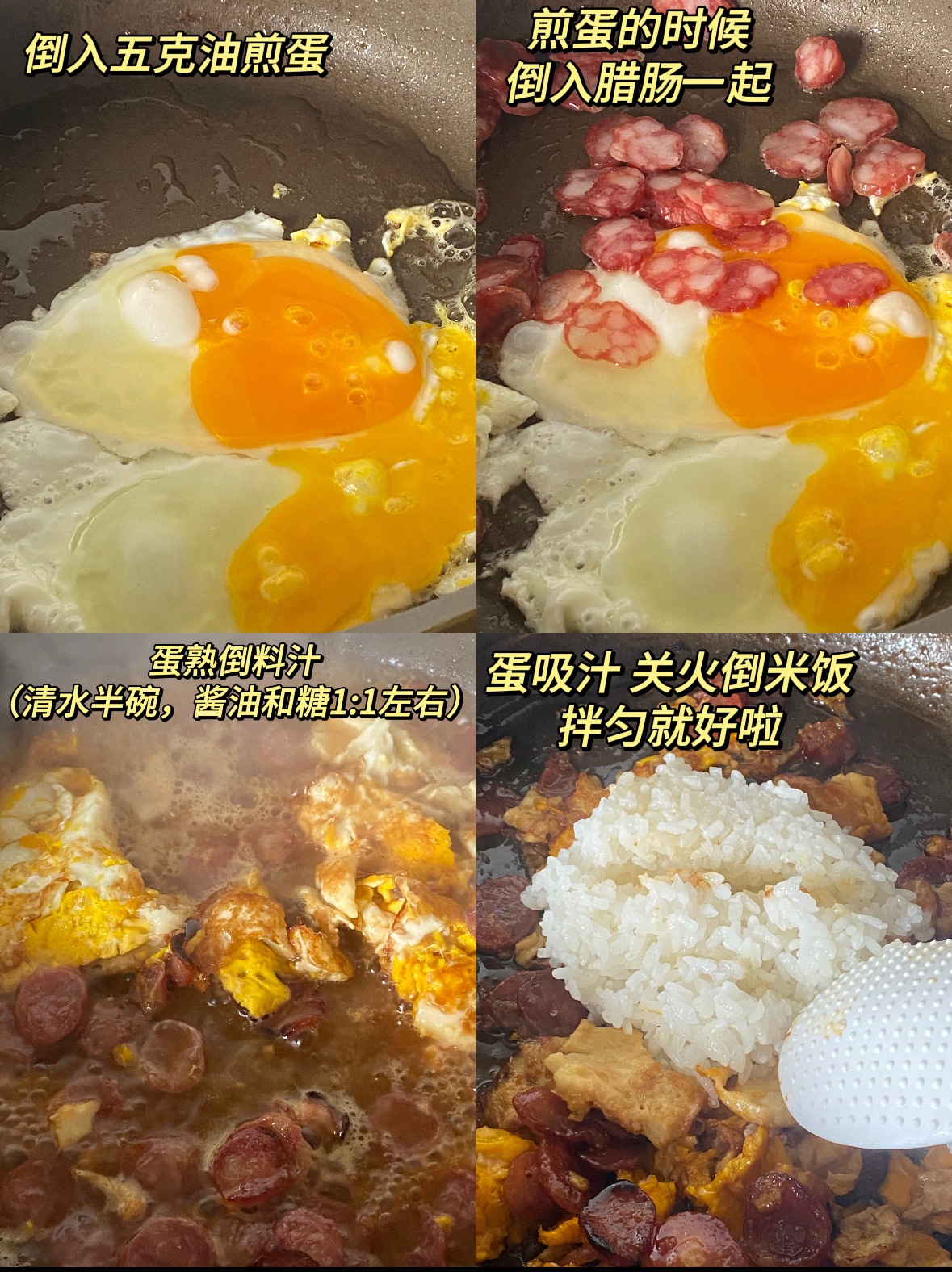 这时,便可关火。将事先准备好的、热气腾腾的白米饭倒入锅中。米饭最好是稍硬一些、颗粒分明的隔夜饭,或者新煮好但稍晾片刻的,这样更容易吸收汤汁而不至于过于软烂。用锅铲或者筷子,趁着锅的余热,将米饭、煎蛋、腊肠和锅底剩下的每一滴精华汁液充分、温柔地拌匀。金黄的蛋液被捣碎,与洁白的米饭你中有我;深红的腊肠片点缀其间,像是雪地里的梅花;每一粒米都裹上了油润酱亮的色泽,散发着无法抗拒的香气。不需要任何额外的装饰或配菜,这一锅本身就已经是圆满。