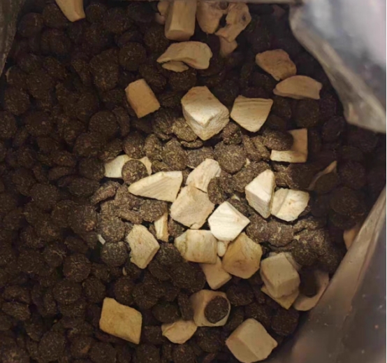 聪颖这款采用的是膨化工艺,摸起来会有一点油腻,但不会影响进食,口感是比较酥脆的。采用了冻干包裹颗粒的方式,添加了2%的冻干鸡肉粒,能够帮助提升适口性,让狗狗获得更好的进食体验。